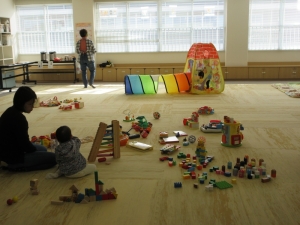 最初に来てくれた男の子は恥ずかしがっていましたが、慣れたら声を出して遊んでいました。いつも来てくれる2歳の女の子は1歳の女の子におもちゃを渡したりしていました。
