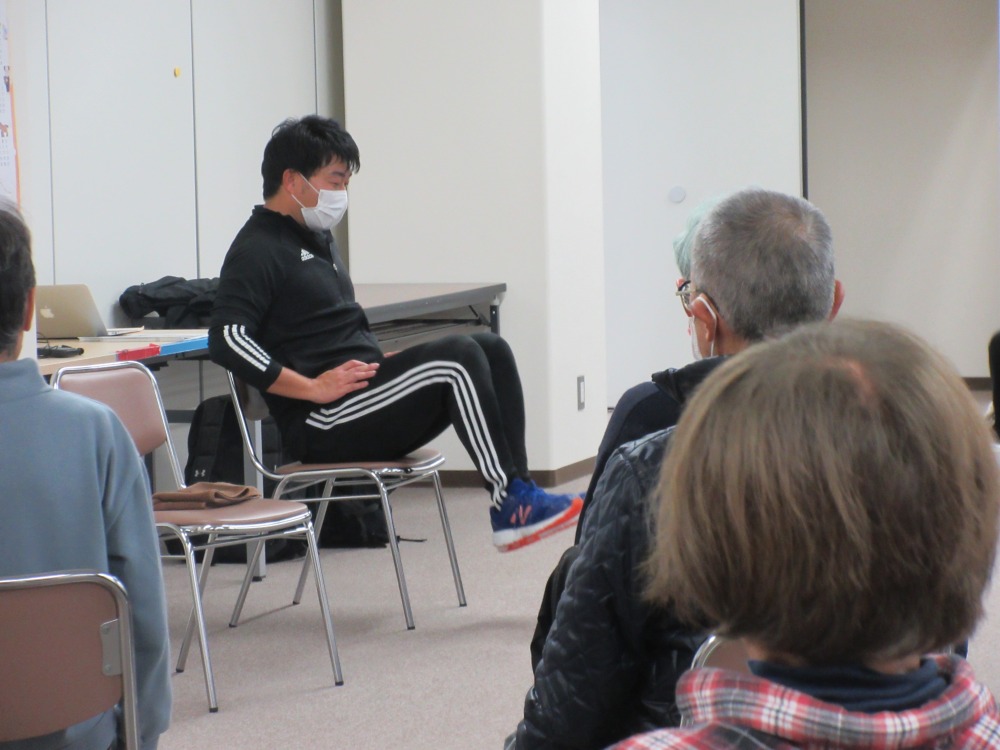 ロコパークの花井 淳史トレーナーを講師に迎え、フレイルについての説明と簡単にできる体操を教えていただきました。