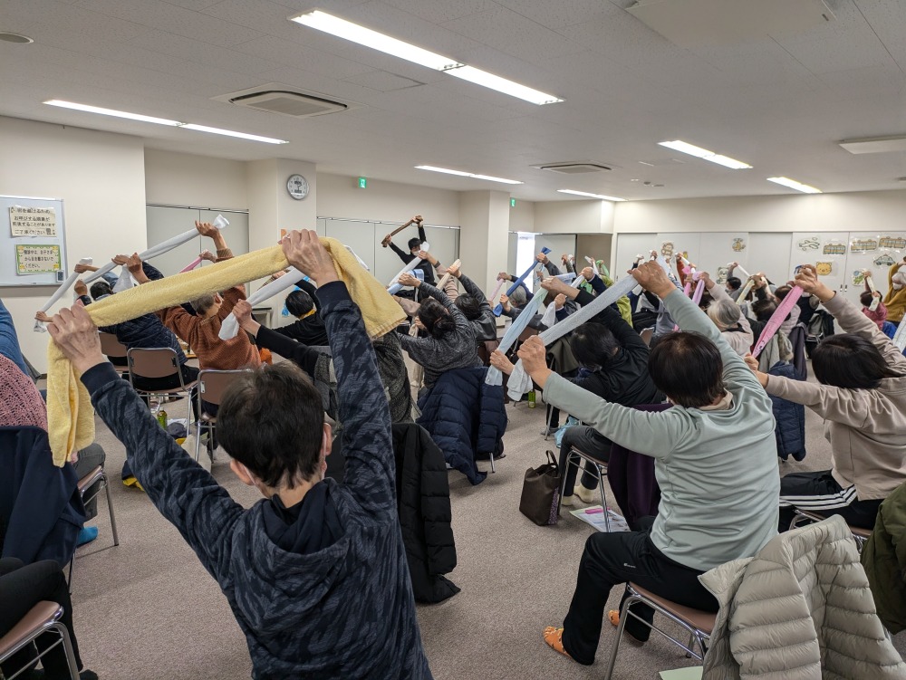 タオルを使って肩甲骨を動かす。太腿には一番大きな筋肉があり、そこを伸ばすなど、椅子に座りながら、家でも簡単にできるストレッチを行いました。