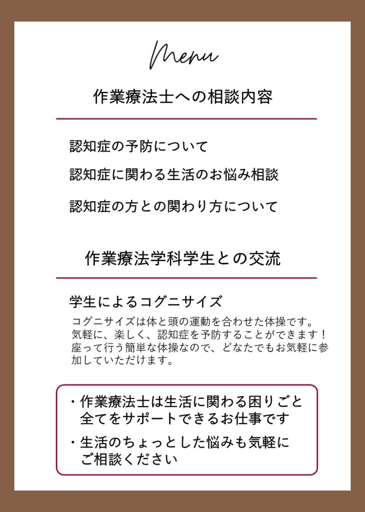 作業療法学科の学生と一緒に交流しながら、認知症について「らく~に」お話してみませんか。