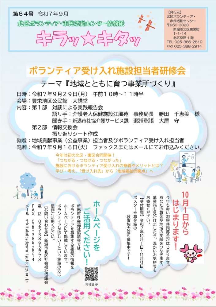 北区ボランティア・市民活動センターでは、令和7年度より情報紙キラッ☆キタッを6月・9月・12月・3月の年4回発行いたします。