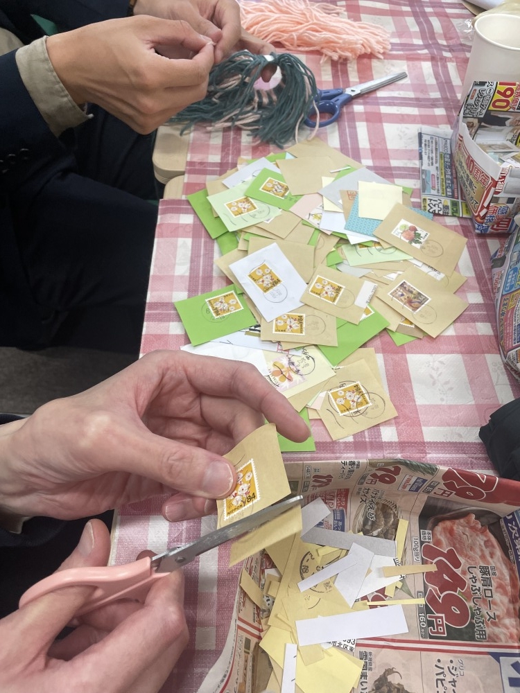切手切りの活動では、好きな絵柄や「こんな切手があったらいいな」といった話題、食べ物の絵柄から好きな食べ物の話へと会話が広がり、自然な交流が生まれました。